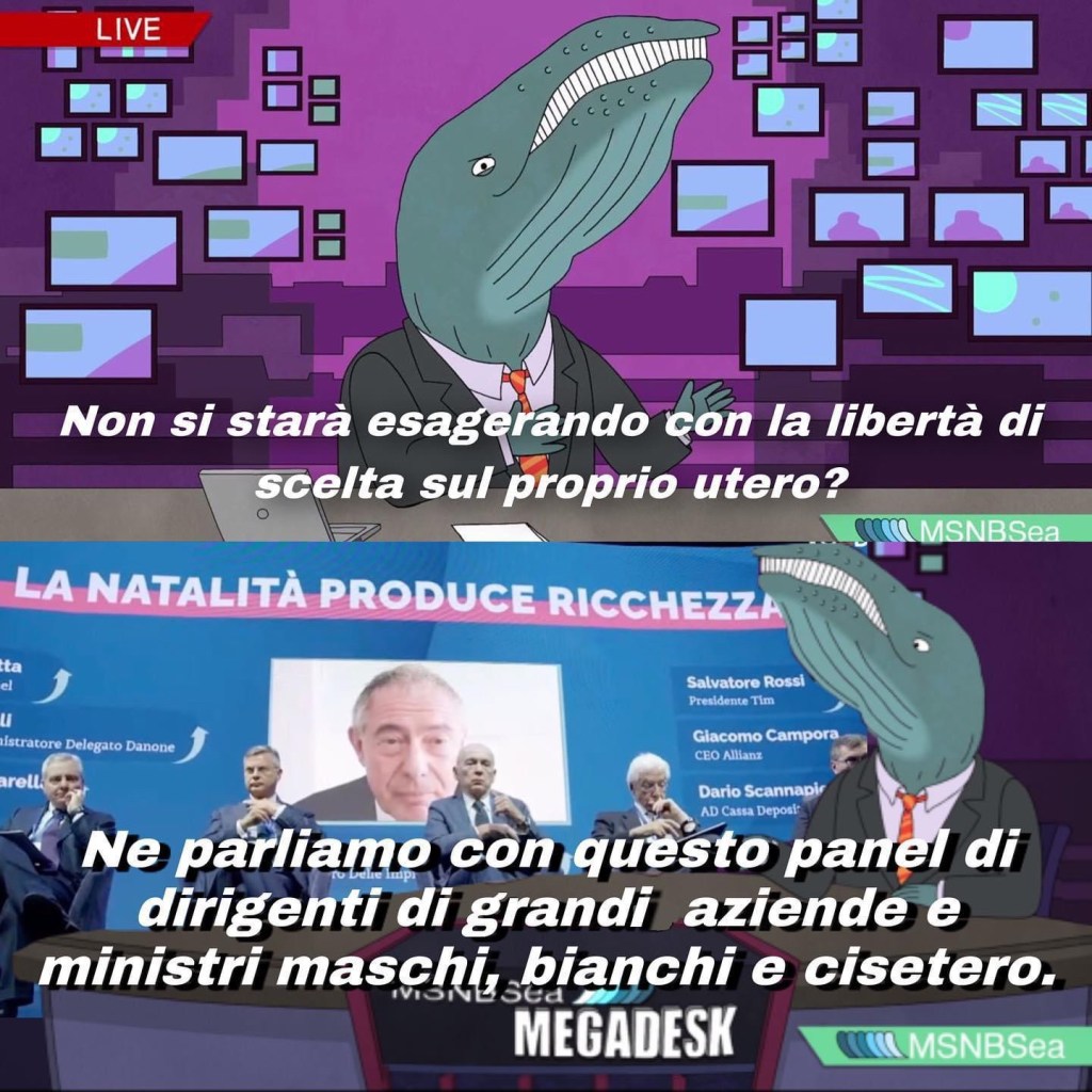 🐳 Agli Stati generali della natalità, sotto il segno de La natalità produce ricchezza, si riuniscono gli AD e i CEO delle maggiori imprese italiane di tutti i settori più rilevanti, dall’industria di trasformazione alimentare (Danone, Plasmon) a quella di trasformazione del tessile (Prenatal) al terziario avanzato delle telecomunicazioni (Tim) alla finanza assicurativa (Allianz), insieme alle controllate dello stato a parziale capitale pubblico (Cassa depositi e prestiti) e ai ministeri competenti (Ministero delle imprese e del made in Italy). Tradotto: la natalità è ricchezza perché dà alle imprese più carne da cannone sfruttabile.