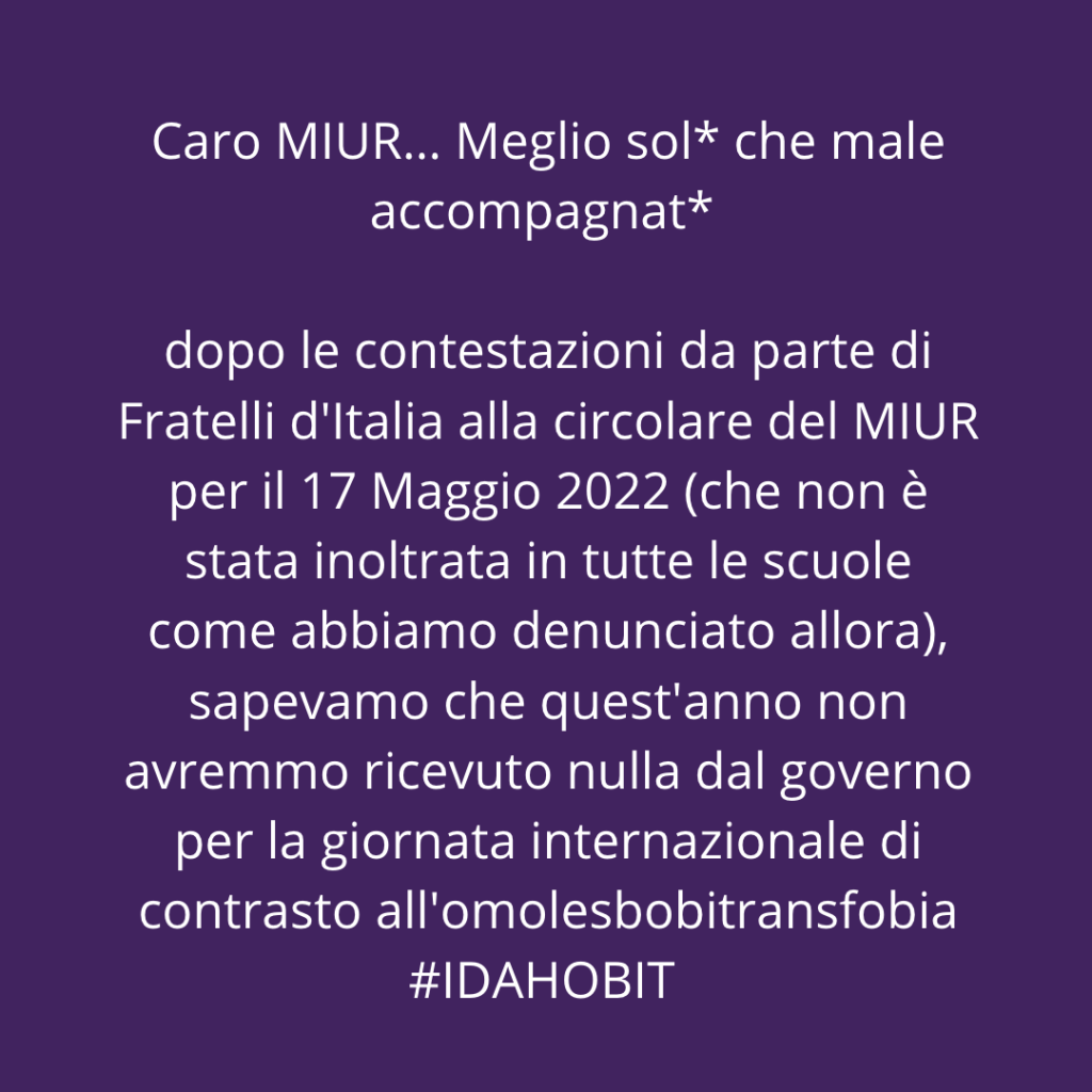 dopo le contestazioni da parte di Fratelli d’Italia alla circolare del MIUR per il 17 Maggio 2022 (che non è stata inoltrata in tutte le scuole come abbiamo denunciato allora), sapevamo che quest’anno non avremmo ricevuto nulla dal governo per la giornata internazionale di contrasto all’omolesbobitransfobia #IDAHOBIT