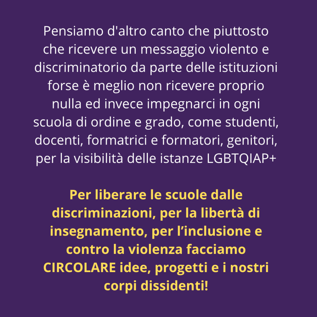 Pensiamo d’altro canto che piuttosto che ricevere un messaggio violento e discriminatorio da parte delle istituzioni forse è meglio non ricevere proprio nulla ed invece impegnarci in ogni scuola di ordine e grado, come studenti, docenti, formatrici e formatori, genitori, per la visibilità delle istanze LGBTQIAP+
